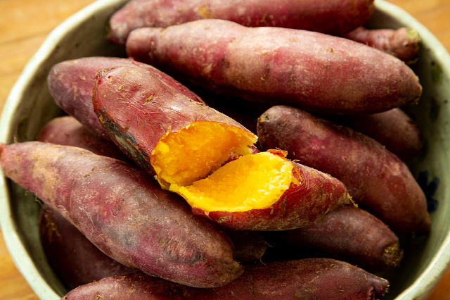 고구마에는 섬유질과 베타카로틴 등이 풍부합니다. 고구마는 장건강과 고혈압 예방에 도움을 주며, 고구마를 잘랐을 때 나오는 하얀 진액인 얄라핀이라는 성분이 장활동을 활발하게 해주고 칼륨이 많아서 염분을 소변과 함께 배출해 주는데 도움을 줍니다.