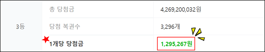 로또 당첨 번호 5개를 맞힌 3등은 3296명으로, 당첨금액은 129만 5267원 씩 받게됩니다.