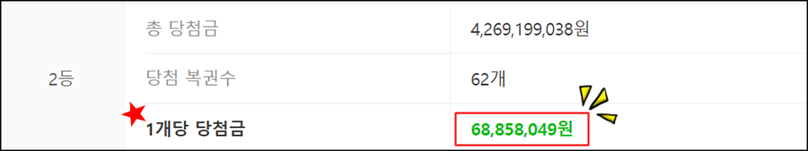 로또 당첨 번호 5개와 보너스 번호가 일치한 2등은 62명으로 각 6885만 8049 원씩을 받게 됩니다.