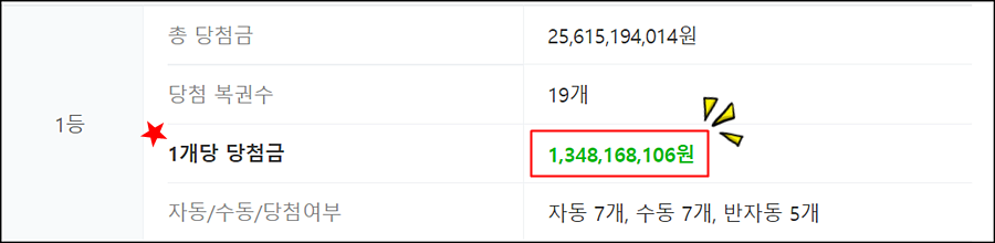 로또 당첨 번호 6개를 모두 맞힌 1등 당첨자는 19명으로 각 13억 4816만 8106 원씩 받게됩니다.